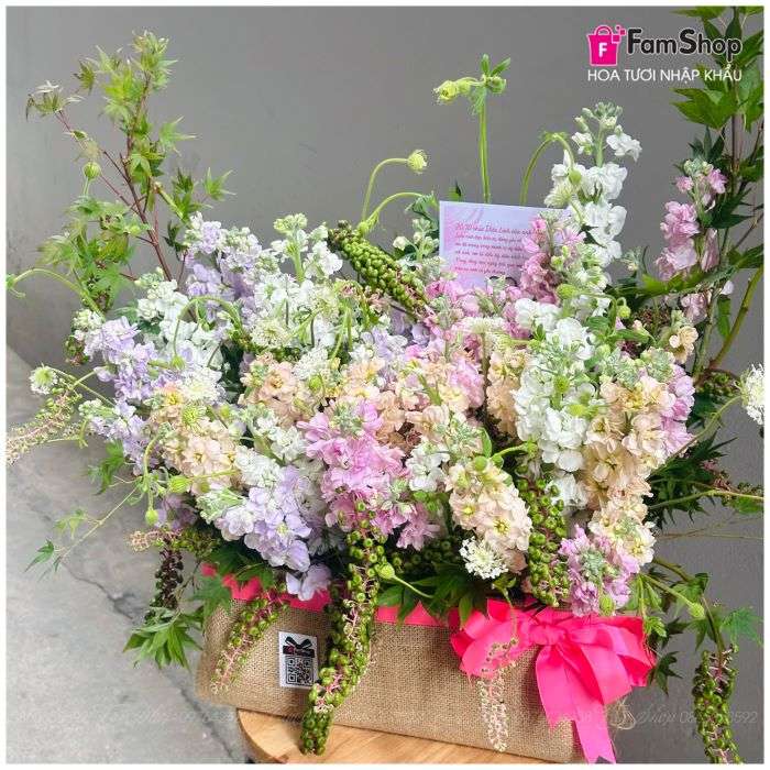 Trong giỏ hoa này, Floris FamShop đã khéo léo phối hợp nhiều sắc thái màu của hoa Phi Yến để tạo nên một tổng thể hài hòa và giàu cảm xúc.